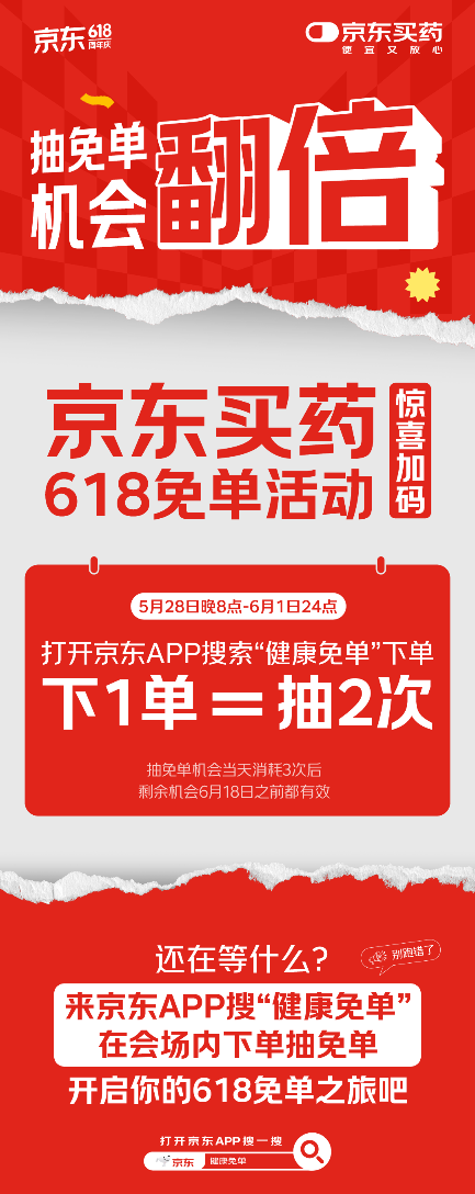 为了回馈消费者热情,京东买药618宣布重磅升级“免单活动”福利!5月28日晚8点至6月1日24点,用户在“健康免单”会场每下一单即可获得双倍的抽免单机会(原一次机会翻倍至两次)。每日抽免单机会仍然保持上限3次,未使用的抽免单机会可累积至次日使用,有效期持续至6月18日24点。