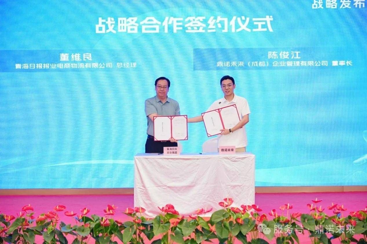 在万众期待的“战略合作、共赢未来”环节,多轮签约仪式相继举行。鼎诺未来创始人、董事长陈俊江与青海日报报业电商物流有限公司总经理董维良签署“青海优质特色农副产品”品牌塑造、推广等方面的战略合作协议,打通“媒体+ 供应链”双向通道,助力青海特色产品走向全国;