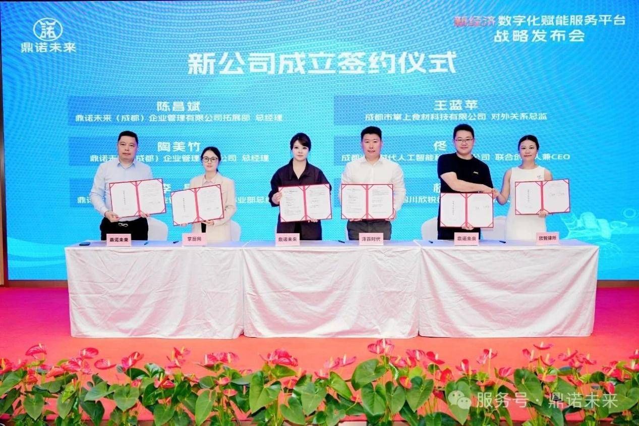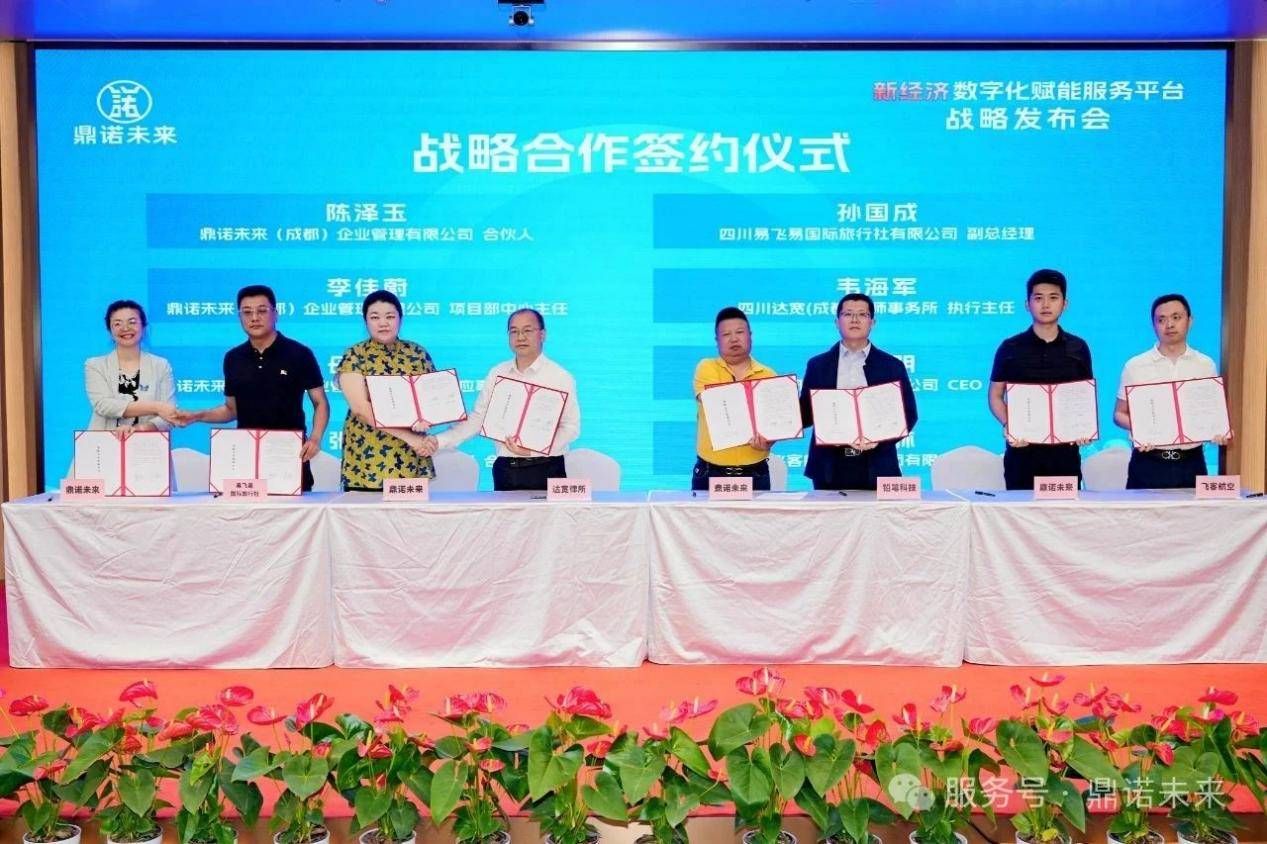 鼎诺未来(成都)企业管理有限公司分别与成都市掌上食材科技有限公司、成都泽霖时代人工智能科技有限公司、四川欣锐律师事务所、四川易飞易国际旅行社有限公司、四川达宽(成都)律师事务所、成都铅笔科技有限公司、四川飞客航空服务集团有限公司签署社区充电、AI技术、文旅IP、法律服务、项目孵化等合作协议;