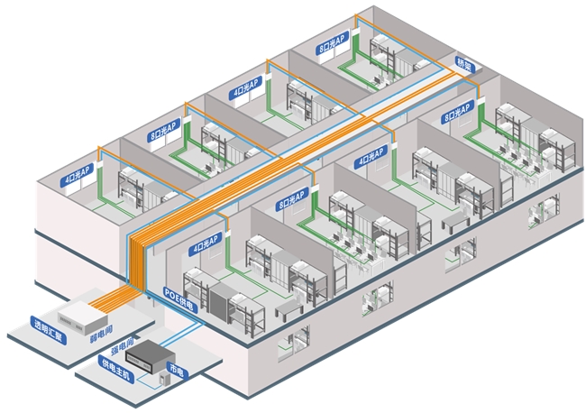 在学生宿舍,高并发娱乐与在线课堂并存,传统供电方式带来不小的安全隐患。彩光4.0通过透明汇聚接入光AP,搭配强电间集中供电主机统一供电,实现网络与供电的彻底解耦。不仅提升了网络稳定性,也有效规避了因私拉乱接引发的用电纠纷,为校园管理带来更高可控性。