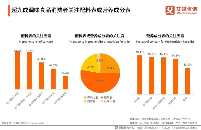 传统“高油高盐高添加”的产品模式逐渐被市场摒弃,消费者对“减钠减添加”的健康需求愈发强烈。iiMedia Research(艾媒咨询)数据显示,鲜(53.0%)、香(48.4%)是消费者购买调味食品时的主流口味偏好1;超九成消费者在选购时会主动查看配料表或营养成分表,51.6%关注防腐剂添加,49.1%关注钠含量,“鲜、香、健康”成为主流诉求。