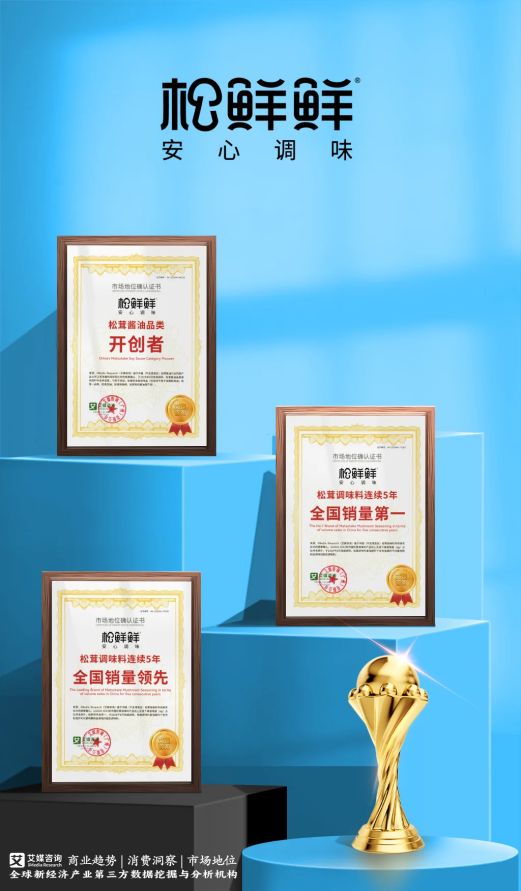 2025年5月,松鲜鲜获全球领先的新经济产业第三方数据挖掘和分析机构iiMedia Reearch(艾媒咨询)授予的“松茸调味料连续5年全国销量第一”“松茸调味料连续5年全国销量领先”“松茸酱油品类开创者”三项市场地位确认。