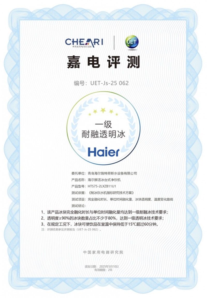 好消息来了!近日中国家用电器研究院与评测中心主办的嘉电评测结果出炉,海尔「鲜活冰」台式净饮机获得“一级耐融透明冰”权威认证,让这个夏天的每一口冰饮,都有了官方“盖章”的品质保障!