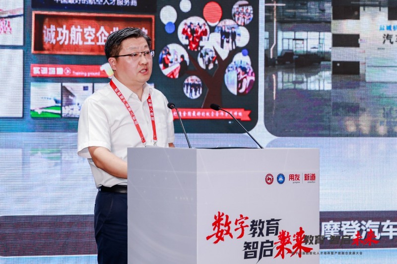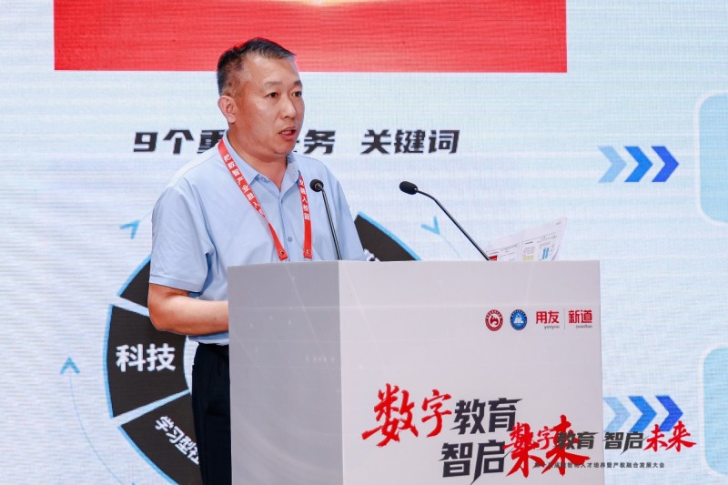 新道科技股份有限公司新道研究院院长宋健为本次大会致辞。宋院长指出在当前信息技术突猛进、产业人才数智化转型的关键时期,更要重视基础人才的培养,从文化基础、技术基础、专业实践基础、职业素养基础等方面落实到位,夯实专业基础,探索建立"技术赋能,育人为本"的职教新路。