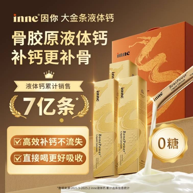 inne因你大金条液体钙,解决了传统钙片补钙引起的便秘、胀气问题。大金条液体钙独家添加骨胶原,直击成人“补钙不锁钙”的痛点,通过补充骨胶原,降低成人骨骼钙的流失,增强骨骼的韧性和强度。“补钙 + 骨胶原”的双重突破,inne 大金条液体钙为国民骨骼健康提供了更科学、更有效的解决方案,临床实验证实,其专利配方可8周显著缓解腿疼抽筋,提升骨密度,直击35岁后骨钙加速流失的核心痛点。