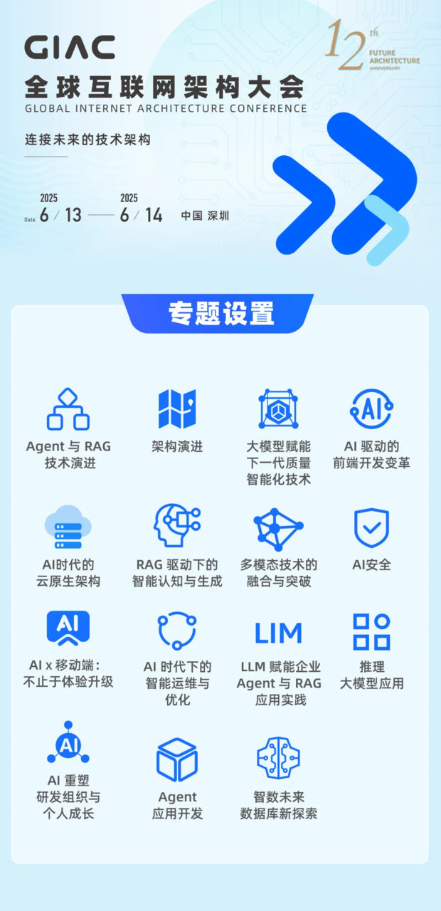 2025 年 6 月,正值快递100十五周年庆典之际,行业迎来 AI 重塑互联网架构的关键浪潮。6 月 13-14 日,第 12 届 GIAC 全球互联网架构大会将在深圳博林天瑞喜来登酒店盛大举行 —— 这场自 2016 年创办、曾见证云计算、AI 工程化等技术崛起的行业盛会,今年将聚焦「大模型产业化落地」,深入探讨生成式 AI、多模态等前沿领域。