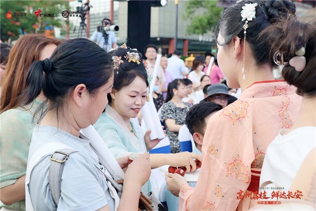 集市上,一个个充满特色的摊位整齐排列,摊位上摆满种类繁多的岭南荔枝及其周边产品,有荔枝干、荔枝罐头,还有荔枝酒、荔枝糕点等等,吸引游客们前来驻足品尝。此外,活动还设置了许多互动环节,新婚佳人可上台互动进行“荔”吻定情、幸运观众通过发送“喜事”照片获赠荔枝、还有集章领荔枝与抽奖互动环节,不仅增加了游客的参与感和体验感,也让更多的人了解了高州荔枝的文化和历史。