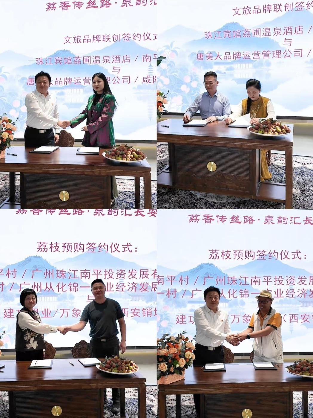 紧随其后的是文旅品牌联创签约仪式。珠江宾馆荔圃温泉酒店、南平静修小镇分别与唐美人品牌运营管理公司、咸阳国际旅行社签署了合作协议。珠江荔圃温泉酒店将与唐美人品牌携手,整合双方资源,共同开发并推广具有浓郁岭南风情的温泉康养旅游产品,旨在提升从化温泉品牌在西安的影响力,为西安游客带来全新康养体验。南平静修小镇则与咸阳国际旅行社达成战略合作,双方将联合设计开发连接从化与西安的特色文旅线路,深度融合从化的自然生态、温泉资源与西安厚重的历史文化底蕴,推出一系列吸引力十足的旅游产品,促进两地游客互访,为文旅产业注入新活力。