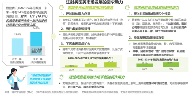 随着人们审美观念的变化、悦己理念的渗透、轻医美市场教育的提升和监管的不断加强,越来越多的消费者对轻医美表现出了较高的接受度和较强的消费意愿。根据腾讯TMI2024年数据,未来一年有34%的消费者有轻医美消费计划(同比增长了36%),其中约1/3(10.9%)的群体为轻医美“新鲜血液”。据观察,这些新鲜血液主要来自于年轻人、男性、下沉市场消费者等群体。除了客群拓展,消费者随着审美的变化而产生的需求的进阶与裂变,在经济波动大背景下催生出的理性消费的态度,共同推动轻医美市场经历变革与创新;以注射类市场为例,针剂材料日益丰富、适应症持续拓展、产品种类不断裂变、产品质量更加专业。