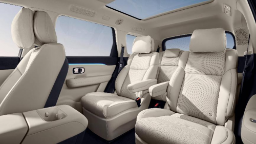这台车的空间表现堪称降维打击。5米车长与3米轴距的黄金比例,让6座布局不再是应急之选:二排独立座椅间距堪比豪华MPV,三排乘客也能获得舒适的腿部空间。更贴心的是,即使满载6人,后备厢仍能轻松容纳3个28寸行李箱,周末露营的折叠桌椅、婴儿车等大件物品也能轻松收纳。