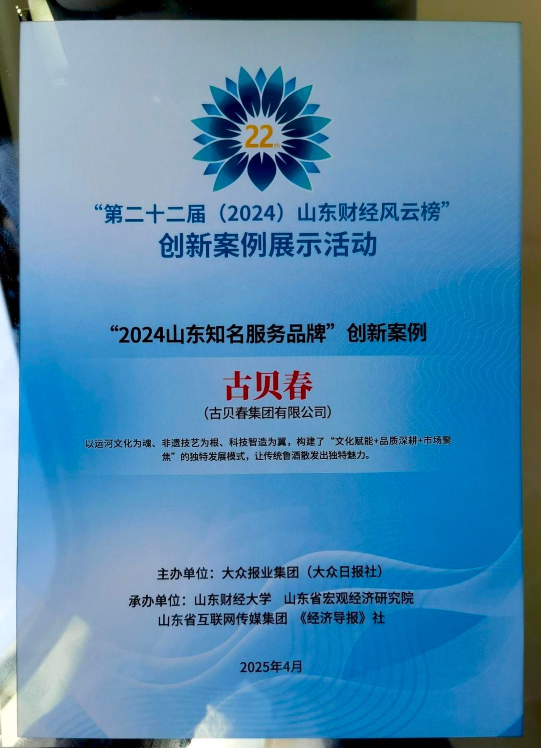 日前,由大众报业集团(大众日报社)主办,山东财经大学、山东省宏观经济研究院、山东省互联网传媒集团、《经济导报》社共同承办的“第二十二届(2024)山东财经风云榜”创新案例展示发布会在济南举行。本届活动以“大省挑大梁 鲁企新担当”为主题,旨在寻找鲁企向新向质的生动案例,发掘引进新变量、培植新优势的标杆力量。古贝春集团凭借“文化赋能+品质深耕+市场聚焦”的独特发展模式,荣膺“2024山东知名服务品牌”创新案例榜单,用切身实践推动服务业提质增效,成为本年度山东白酒行业唯一入选企业。