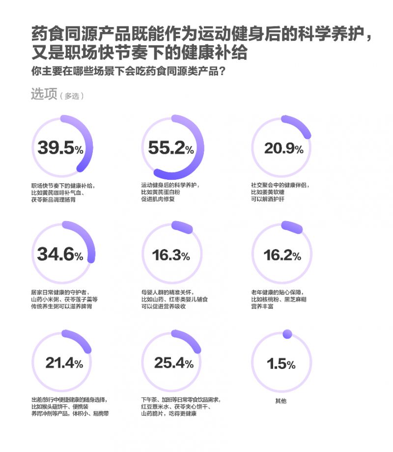 在此背景下,“药食同源”概念正在逐步渗透至消费者日常生活。从场景来看,55.2%的消费者会在运动健身后选择“药食同源”产品进行科学养护,比如黄芪蛋白粉促进肌肉修复;39.5%的消费者会在快节奏的职场中将其作为健康补给,有消费者表示,“独立包装的红枣黑芝麻丸方便携带,在办公室里吃两颗,关键时刻充饥补充能量”;34.6%的消费者则将“药食同源”产品作为居家日常健康的守护者。