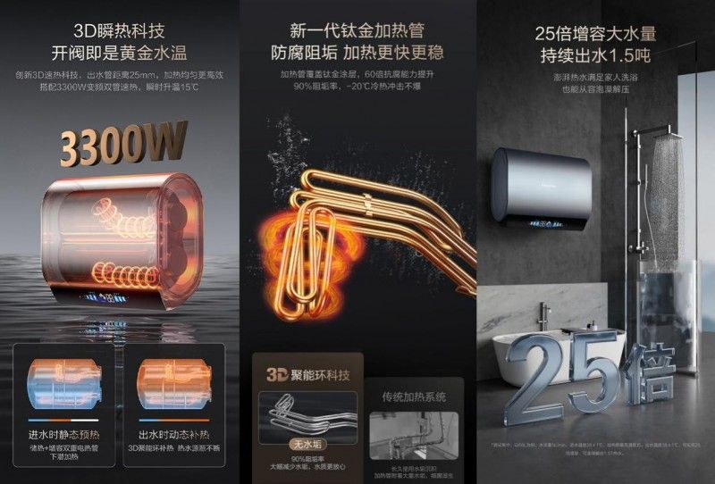 为解决用户等待时间长、水温不够热等痛点问题,海信3D速热电热水器DS11Ultra应用3D速热科技。区别于传统的单管加热,其创新配置的3D聚能环及25mm超短出水管距,让水流经过出水口时瞬时升温15℃。配合储热及动态加热的无缝衔接,能在进水时静态速热,出水时动态补热,让用户真正实现即开即洗,无需等待。此外,其采用的新一代钛金加热管及3300W变频双管,兼具高抗腐性与变频速热,经久耐用,加热效能抗打不衰。