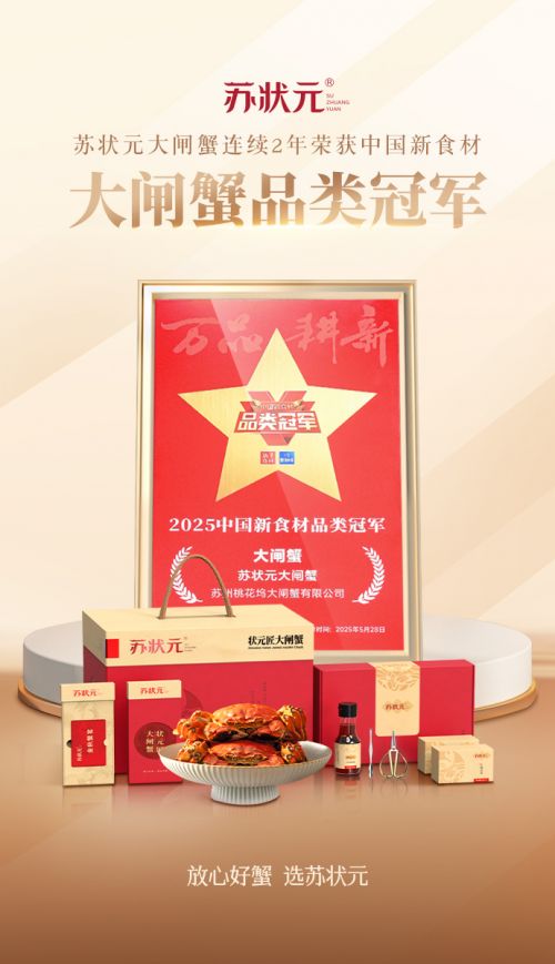 2025年第三届新食材品类冠军大会上,苏状元再度加冕大闸蟹品类冠军,成为行业唯一 “双冠王”。