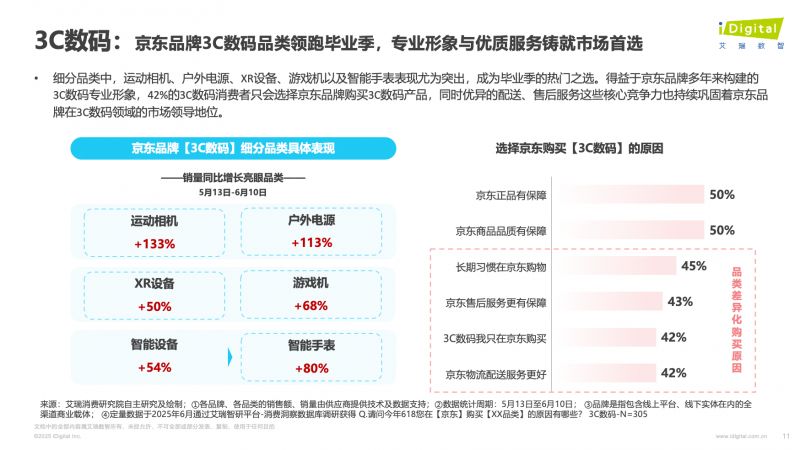 3C数码和家用电器等带电品类是618大促的“重头戏”,京东在该领域卓越表现,持续巩固行业领先地位,销售占比及增速均位列第一,优势进一步扩大。
