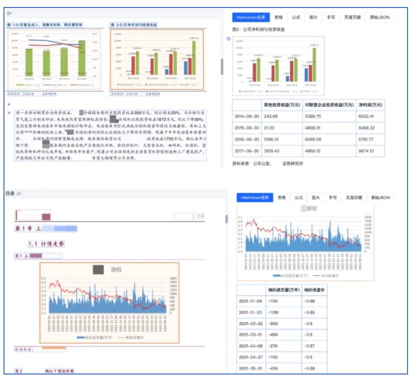 金融文档常常是文本、表格、图表、公式、印章、签名等多种元素的综合体,理解元素间的语义关联至关重要。TextIn文档解析不仅能识别单个元素,更能理解元素间的上下文关系,例如:识别图表标题与对应图表,理解表格数据支撑的正文论点。这种深度的结构化解析能力,为后续大模型进行智能审核(如数据一致性校验、关键条款比对、风险点关联分析)提供了高质量、语义清晰的输入。