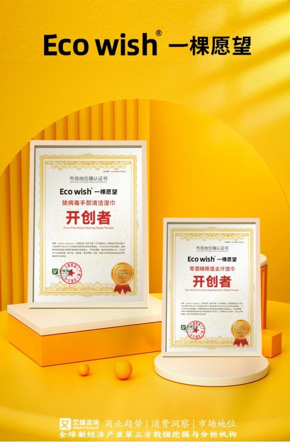 近日,EcoWish获全球领先的新经济产业第三方数据挖掘和分析机构iiMedia Research(艾媒咨询)授予的“除病毒手部清洁湿巾开创者”“零酒精降温去汗湿巾开创者”双项市场地位确认。