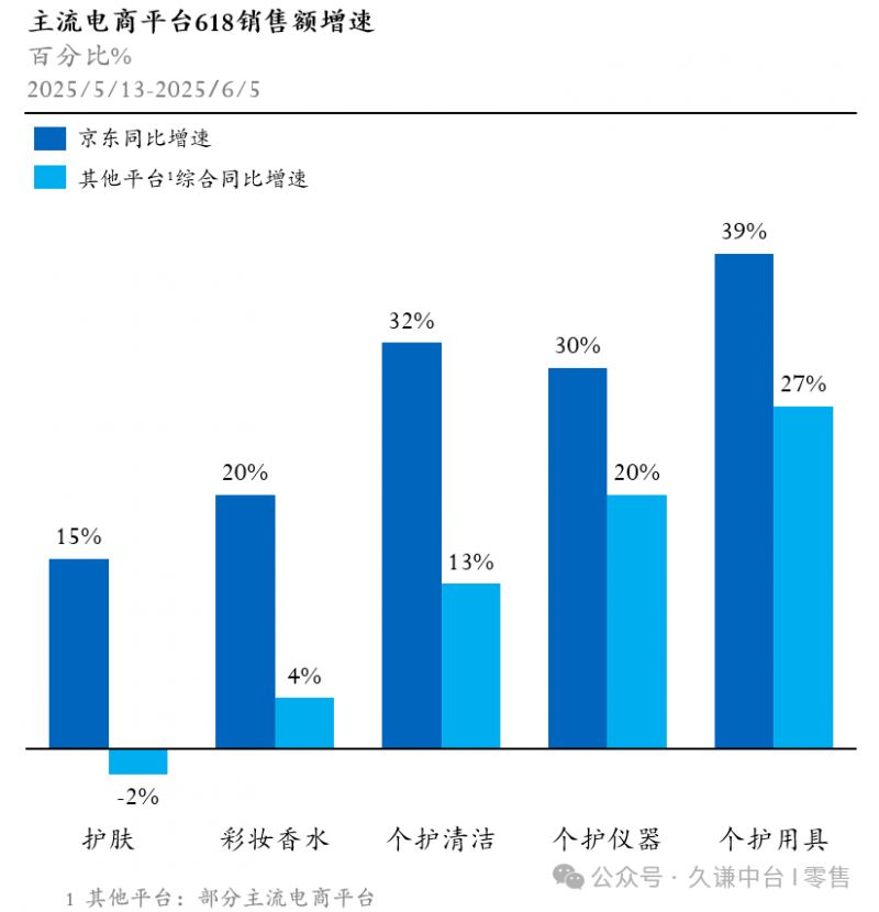 在美妆个护领域,京东以“价格简化+商户共赢”双核策略突围。“半年最低价”策略(活动价低于180天最低价自动参与)和“官方立减15%”的简化规则,消除凑单复杂性,直接降低消费决策门槛,同时配合领券满1000减120、PLUS会员满1500元减120元等定向优惠直接让利给消费者。针对在6月 30 日前入驻的美妆新商家,京东推出了佣金激励政策,促进品牌商家实现高质量增长。618周期内,京东在个护用具、个护清洁等几个品类的销售额同比增速均在30%以上,高于其他平台综合同比增速。