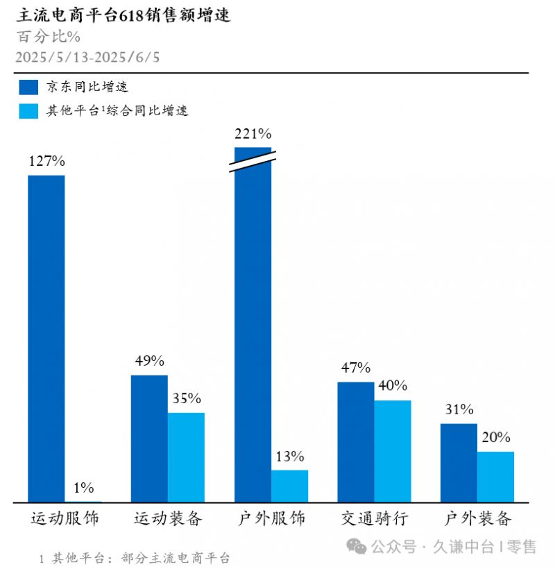 618期间京东持续精选高质价比运动健身产品,覆盖陆冲、马术冲浪等新兴小众运动装备品类,强化京东户外运动产品“高专业性、高品质”的消费认知,持续提升专业运动人群在京东平台的消费偏好度。此外还整合“国补”与“百亿补贴”资源,推出“补上加补”活动,释放价格优惠势能,销售额增速显著,户外服饰品类实现221%的超高速同比增长,运动服饰品类增速127%,均远高于其他平台综合同比增速。