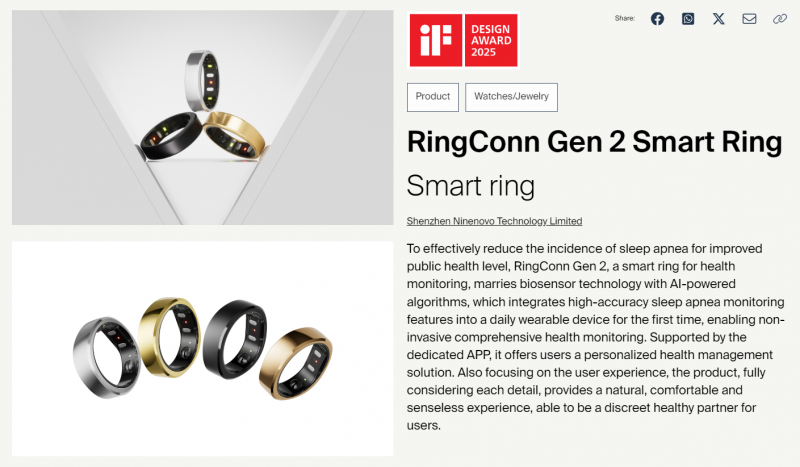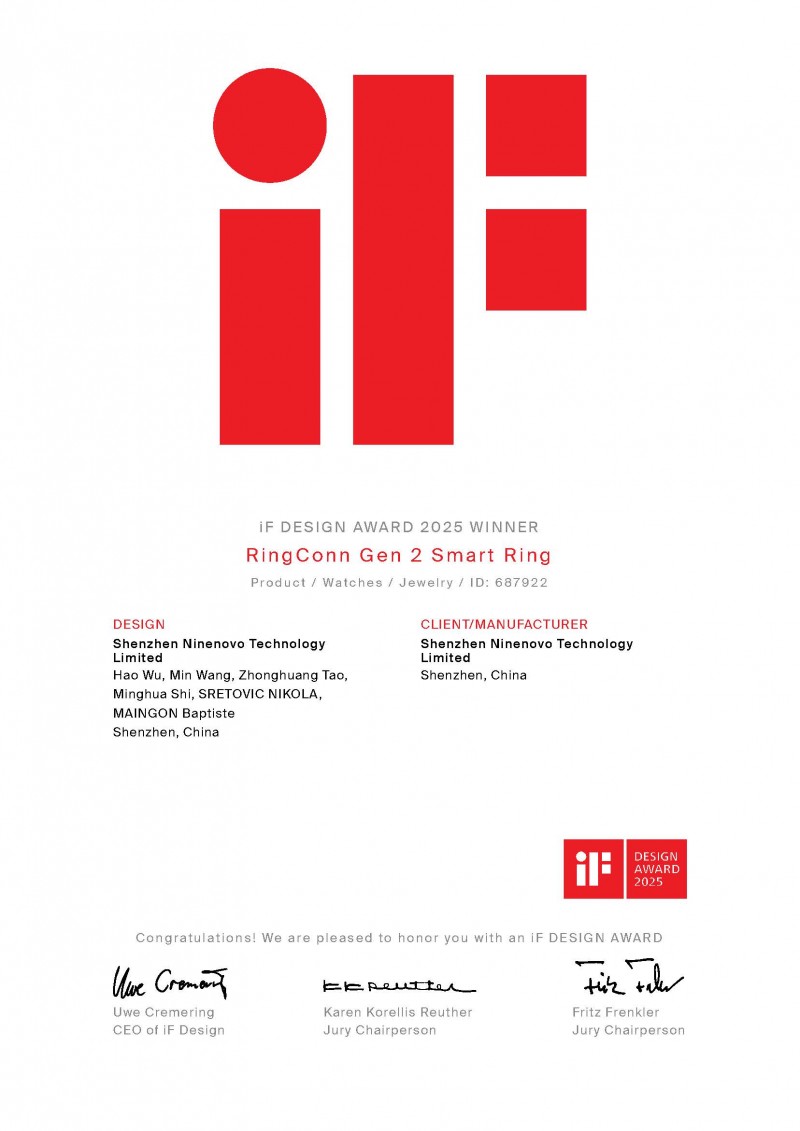 2025年,RingConn 2代智能戒指凭借卓越的产品性能和设计创新,从全球近10,000件参赛作品中脱颖而出,斩获2025年度IF设计奖,产品获得了国际权威认可。
