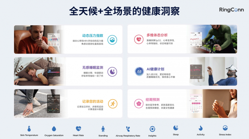 除了突破性的睡眠呼吸暂停监测功能,RingConn 2代智能戒指还提供了一整套的健康监测方案,包含睡眠监测、运动监测、压力监测、女性健康管理,以及异常指标提醒等,为用户日常健康管理提供全面的数据支撑和建议。