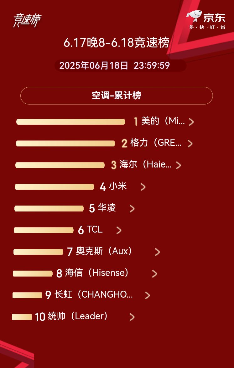 在2025 抖音商城 618 好物节大促赛马榜品牌排行榜中,美的、格力、海尔仍一同位居前三,在新兴电商渠道的竞争力依旧强劲。天猫平台大家电空调行业 618 全周期品牌销售榜排名同样如此。