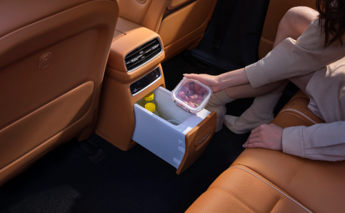 第二个是支持5°C或50°C的智能冷暖冰箱。夏天出门,孩子的酸奶、水果可以保持新鲜;冬天自驾,热牛奶、温开水随时供应。更贴心的是,即使车辆熄火后,冰箱还能工作12小时,这意味着即使在服务区过夜,也不用担心食物变质。
