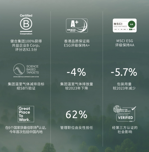 坚守 “让人们更健康、更快乐” 的使命,健合以 “提升健康意识、减少环境足迹、支持公平发展、完善企业管治” 四大领域为核心,推动可持续发展理念落地。2024 年,企业通过全产业链协同的共享价值增长模式,取得重要成就:全球 100% 实体提前一年获得 B Corp 共益企业认证,以 92.5 分的优异表现,证明社会与环境责任已深度融入企业运营,为行业商业转型提供示范。