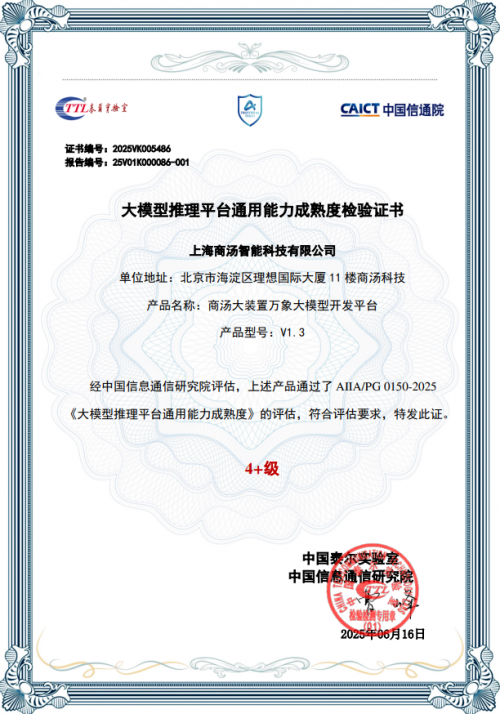 商汤大装置万象大模型开发平台,获得当前最高评级——4+级,并成为国内首家获得最高评级的大模型推理平台。