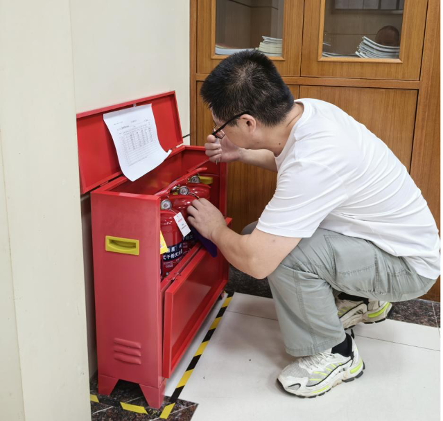 当清晨的第一缕阳光斜照进来,兼职安全员正半蹲在消防柜前,严谨细致地检查灭火器压力表,确保每个灭火器都能正常使用,金属柜面映出他专注的侧脸。