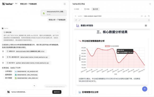 近日,灵快科技推出了能自主进化的 AI 数据分析师 TabTab 。TabTab 能帮助用户加速数据分析和业务洞察,它能模拟人类思维,通过多轮思考与工具调用,以 AI Coding 等方式呈现精美的可视化成果。TabTab 是一个 AI Agent 团队,包含规划与执行 Agent、数据科学 Agent、长文本报告撰写 Agent、DB Agent、通用编程 Agent等,以及若干子 Agent 和实用工具,针对数据分析场景,TabTab 围绕从数据采集、数据处理、数据分析到智能决策的全闭环流程做了深度优化。
