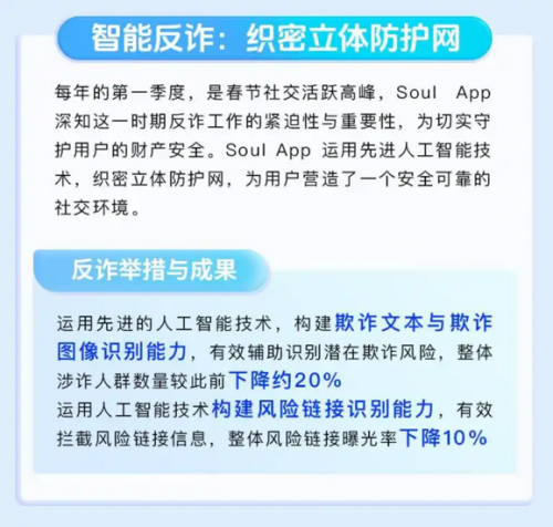 每年第一季度是春节社交活跃高峰,网络诈骗风险也随之上升。为切实守护用户的财产安全,Soul App 运用先进的人工智能技术,织密立体防护网。Soul构建起先进的欺诈文本与图像识别能力,能够敏锐捕捉潜在诈骗风险。通过这一技术升级,平台整体涉诈人群数量较此前下降约20%,让许多用户避免陷入诈骗陷阱。同时,Soul还构建了风险链接识别能力,对风险链接信息进行精准拦截,使整体风险链接曝光率下降10% 。这些技术如同“数字卫士”,时刻守护着用户的社交安全,极大提升了平台的反诈能力。