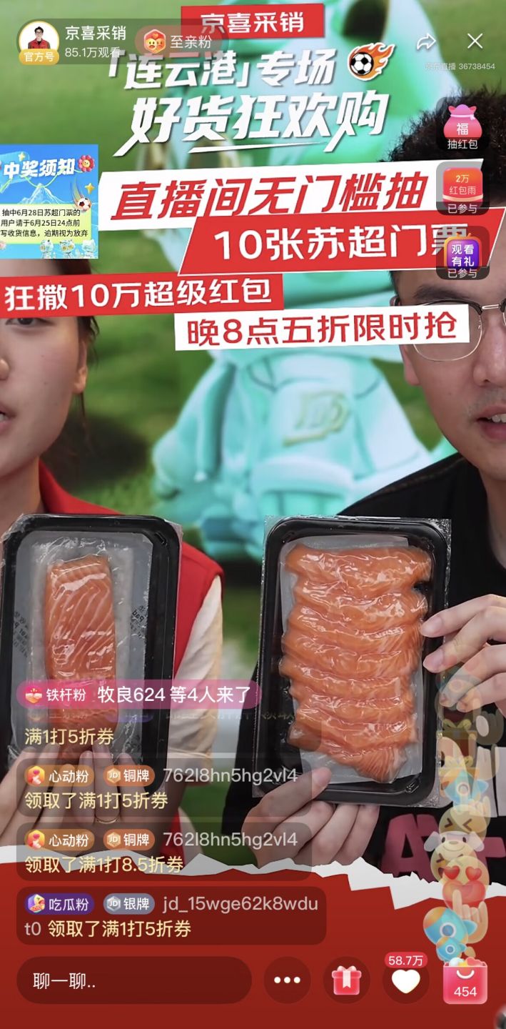 “苏超“持续升温,在今年夏天点燃了全民足球热情,也点燃了网友们的消费热情。6月25日,京东京喜自营携手连云港当地政府和产业带商家,在京喜采销直播间开启苏超连云港专场直播活动,凭借沉浸式“云游港城”、免费抽送10张苏超门票、现场烹制当地特产等亮点,吸引用户积极参与,以创新方式带动当地特色产品爆卖全国。