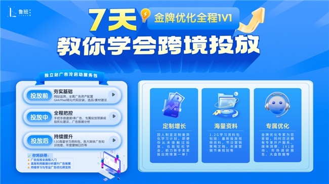 鲁班跨境通还专门针对新手卖家打造了“海外广告投放入门计划”,7天教0基础卖家学会广告投流,通过金牌优化师 1V1 指导完成从网站监测、广告搭建到数据优化的全流程实操;
