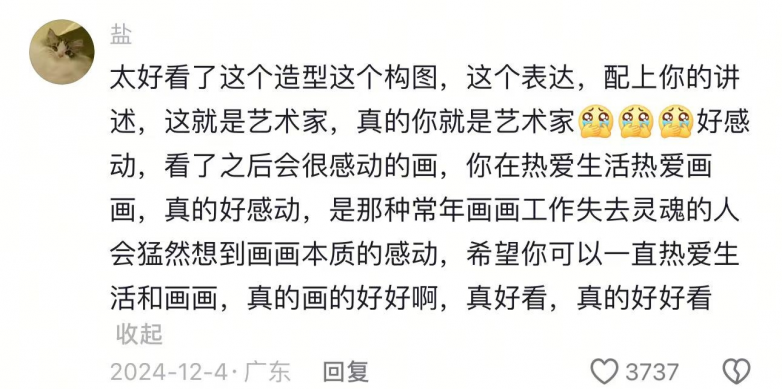 在数字媒体快速发展的当下,游淇淇善于运用短视频这一载体,将传统艺术创作与新媒体表达相结合。每段约一分钟的视频,既是对创作过程的真实记录,也是她与大众之间建立连接的桥梁。她的多个视频在社交平台上获得了数百万次观看与广泛讨论,吸引了大量年轻观众走近她的绘画艺术。