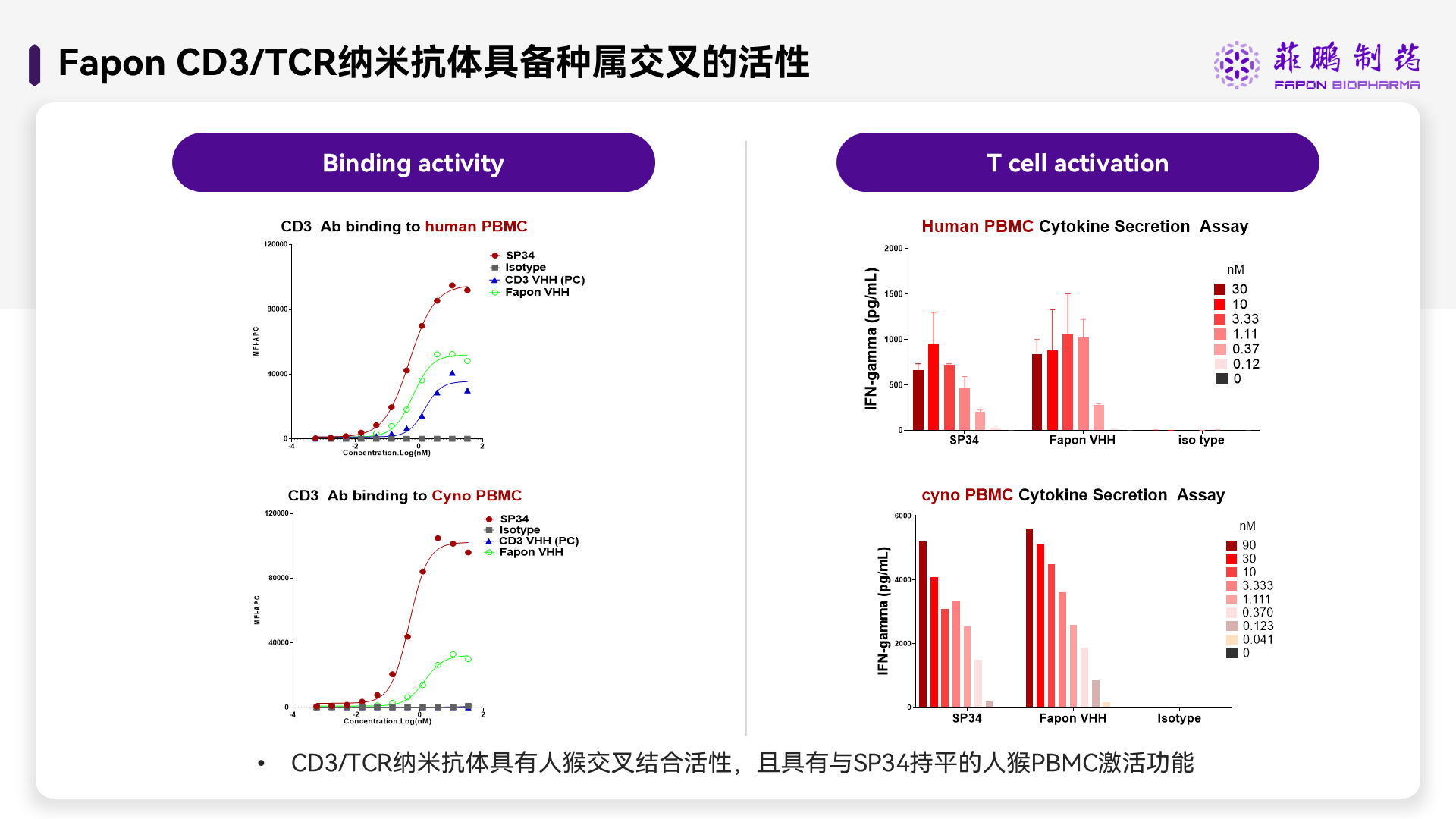菲鹏制药针对行业痛点,打造了差异化的双/三抗TCE平台,不断升级CD3/TCR纳米抗体开发策略,针对CD3/TCR结构设计多样化的免疫、筛选方案。菲鹏制药开发的CD3/TCR纳米抗体具有人猴种属交叉结合活性,并且理化性能稳定,在未来多功能TCE分析构建中具有显著优势。由该纳米抗体组成的TCE分子安全性高,成药性优异,具有很大的竞争优势。基于菲鹏制药CD3/TCR纳米抗体,公司开发了同时靶向CD19和BCMA双靶标TCE治疗系统性红斑狼疮(SLE)、含第二信号的三抗TCE治疗实体瘤、偏向性CD8⁺T TCE治疗实体瘤等的TCE项目,在临床前实验中展现出优异性能,将为肿瘤及自身免疫性疾病治疗提供更好的解决方案。