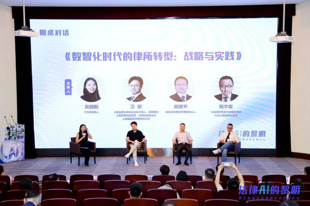 “数智化时代的律所转型:战略与实践”圆桌对话由千万趴创始人吴丽阳主持,参与对话的嘉宾包括上海法律科技协会法定代表人、副理事长,上海市律协信息委、法律科技委主任,上海星瀚律师事务所主任卫新;建纬律师事务所管理合伙人顾增平;大成律师事务所董事局董事、大成上海管委会委员杨宇宙。围绕律所数智化转型的战略规划、技术落地、管理模式创新等核心议题,结合各自的实践经验,展开探讨。这场对话在多维度、多视角的思想碰撞下,为律所数智化转型提供了兼具战略维度和实践价值的行业洞见。