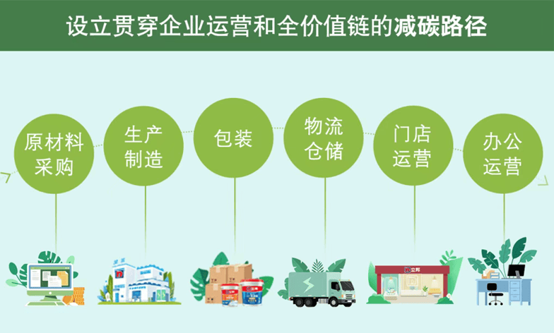 立邦构建了覆盖原材料采购、生产制造、包装、物流仓储、门店运营和办公运营环节的减碳路径