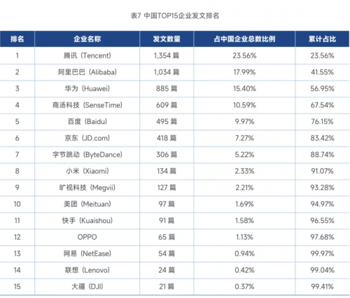 中国发文最多的前三名企业分别为腾讯(1,354篇)、阿里(1,034篇)和华为(885篇),而美国前三名企业为谷歌(2,895篇)、微软(1,582篇)、Meta( 1,419篇)。