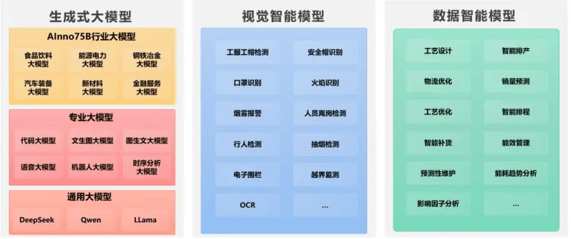 平台不仅接入了创新奇智自研工业大模型AInno75B,还支持大多数私有化部署模型,如DeepSeek系列、Qwen系列等模型的一键接入功能,极大简化了企业级应用的部署流程。