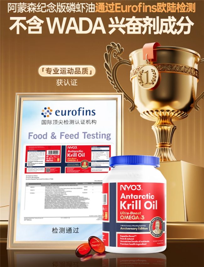 NYO3阿蒙森磷虾油近期通过国际检测巨头Eurofins的200余项世界反兴奋剂机构(WADA)禁用物质筛查,成为全球极少数适用于专业运动员的“零风险”营养品。此项认证进一步夯实其挪威纯净基因——从南极溯源到挪威本土生产,全链路透明可控。凭借高品质和高标准,品牌已斩获ORIVO连续五年零缺陷品质认证和IKOS纯油认证,并荣登欧睿国际“连续两年全球磷虾油销售额领先”及“全球高磷脂磷虾油销量第一”认证,奠定挪威品质全球话语权。