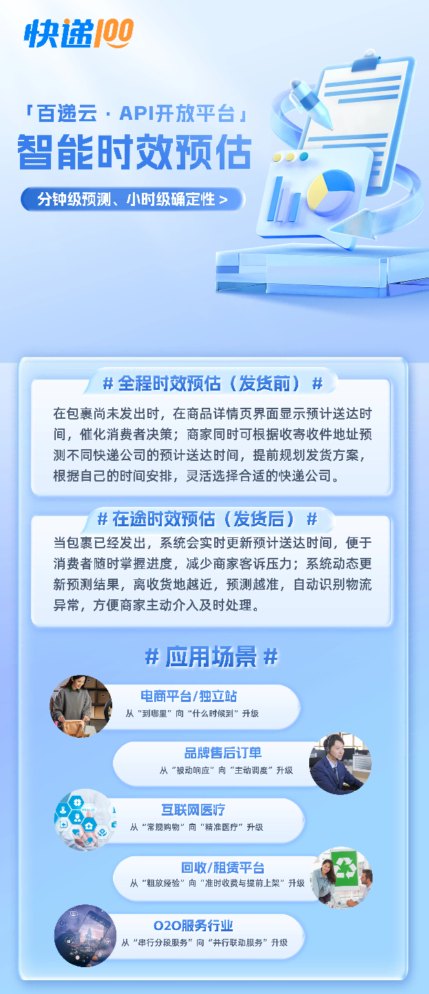 无论是荔枝等生鲜的预计到达时间,还是贵重货物的提前排期入库,都可以借助「百递云·API 开放平台」得以实现。实现快递查询从“快递到哪里了”向“快递何时可到”的范式转变,提供“分钟级预测、小时级确定性”,为企业及其消费者创造“安在当下、从容未来”的美好生活体验——“只要快递在路上,生活就有盼头!