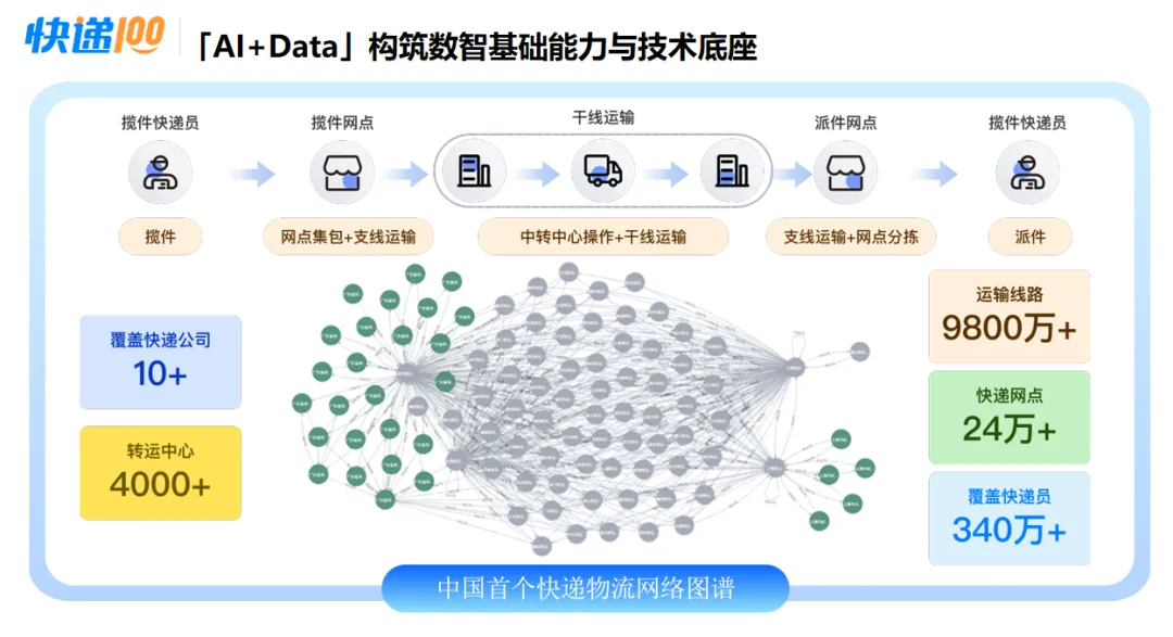 2025年6月23日,在第12届GIAC全球互联网架构大会上,快递100重磅发布了中国首个快递物流网络数智图谱,现阶段初步涵盖了中国主流的十家快递公司,覆盖4000多个转运中心/中转站,9800多条运输线路和24万个快递网点/服务点,覆盖超过340万名快递员。