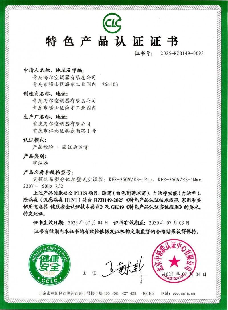 7月8日,由佳合(浙江)检验检测有限公司主办的首批通过“健康安全”认证产品发布会在浙江慈通过RZB149-2025《特色产品认证技术规范 家用和类似用途电器 健康安全认证技术要求》系列标准检测的“健康安全”认证家电产品发布,在空调行业头部品牌里,只有海尔空调获得认证。该认证由中国家用电器研究院指导,佳合检测公司与北京中轻联认证中心有限公司(CCLC)联合推出。