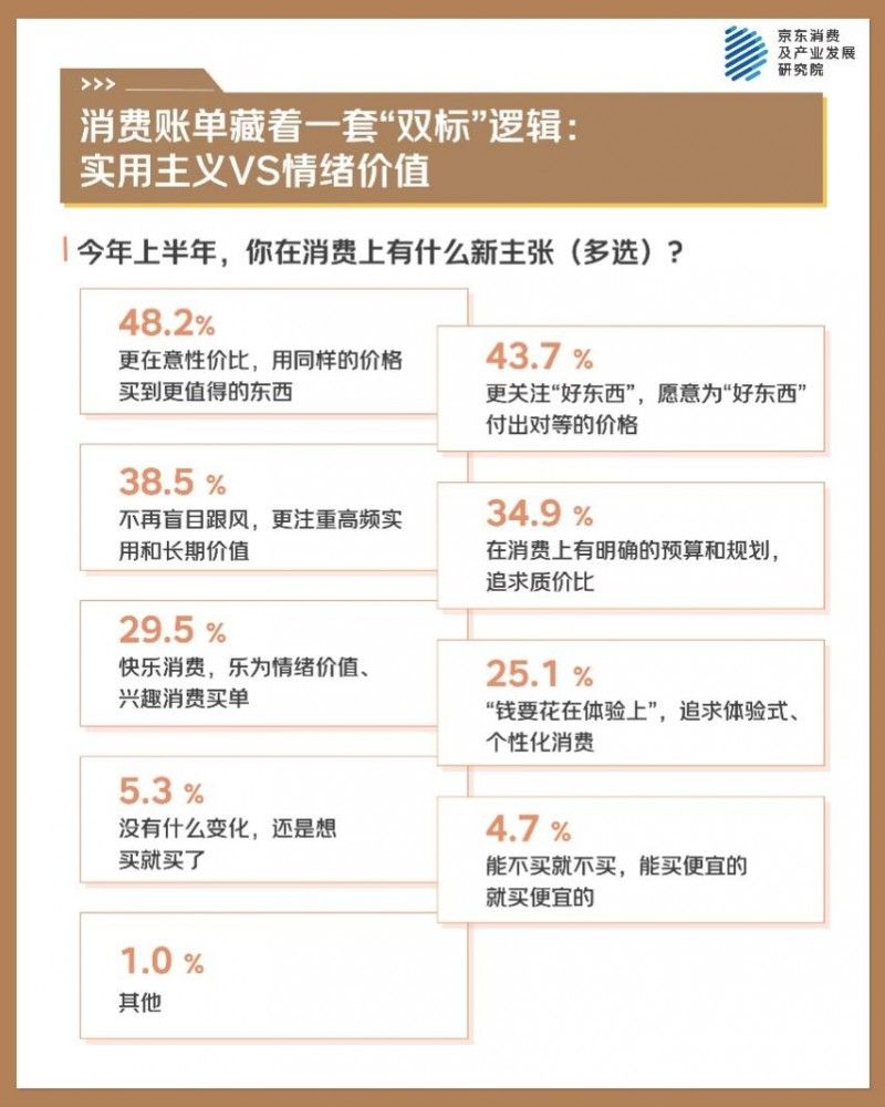 -消费呈现“双标”特征,实用主义和情绪价值成为拉扯的两级。近五成人更在意性价比,近四成人注重高频实用和长期价值,还有近三成追求情绪价值、兴趣消费。