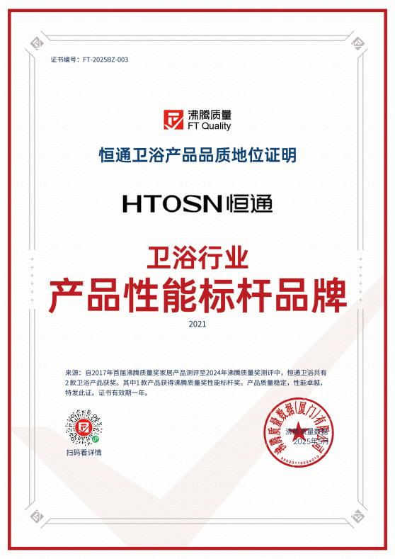 恒通卫浴所获得的众多荣誉,是其在品质把控、创新研发、行业影响力等方面卓越表现的有力证明。这些荣誉不仅见证了恒通卫浴过去的辉煌,更激励着其在未来继续秉持“品质改变生活”的品牌理念,不断提升产品品质,持续创新,为消费者带来更多高品质、个性化的全卫定制解决方案,在卫浴行业中续写更加辉煌的篇章。