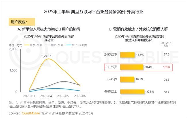 QuestMobile数据显示,2025年4月,京东外卖相关内容在内容平台获得了超过2000万次的互动量,5月京东APP中,外卖所在入口获得超过1.6亿的用户。