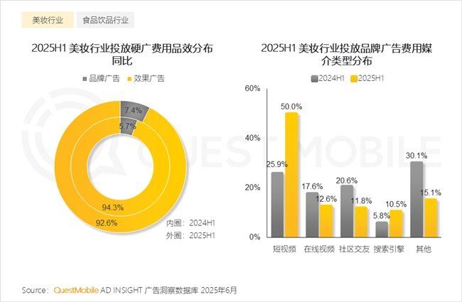 QuestMobile数据显示,2025年上半年,美妆行业投放硬广中品牌广告占比为7.4%,较去年同期提升1.7个百分点。