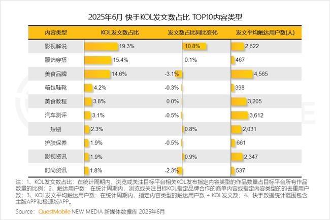 Ⅴ. 快手平台发文内容集中在影视解说、服饰穿搭、美食品牌方面,比例近50%,但发文平均触达人数相对均衡