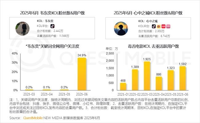 2025年6月4日,“韦东奕”抖音账号悄然上线,引发网络极大关注,截止目前账号虽然只有一条4秒的个人介绍短视频,但根据QuestMobile数据统计,其账号6月去重活跃用户数已达1.15亿;“心中之城”主创成员曾任职“毒舌电影”所属公司长达8年,2025年初开启独立创作之路并在4月9日上线首条短视频,QuestMobile数据显示其6月合计粉丝数已达到2303万,去重活跃用户数达6743万。